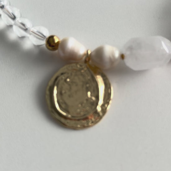 Quartz & Acrylic Coin Necklace with Freshwater Pearls – Statement Handmade Jewelry